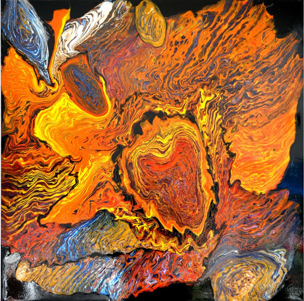 Les fonds marins l’inspirent et à travers ses toiles, on peut ressentir le mouvement des vagues, l’écume des mers agitées, la course d’un poisson pressé, ou la douceur des coraux par delà une eau limpide. Observateur discret, Lorenzo porte parfois son regard sur un détail : ses créations vous amèneront à explorer votre imaginaire. Que voyez-vous ? une photographie satellite de notre jolie planète, l’observation des stries de la roche, la coupe d’une agate ? Lorenzo se promène dans votre jardin, secret ou réel, pour donner vie à des fleurs multicolores, parfois bien réelles, ou parfois rêvées. On sent le minéral et le végétal qui se dégagent de son travail. Sa technique est surprenante, puisqu’il réalise ces peintures sans pinceau, associant ces couleurs par mouvement et les figeant au chalumeau.